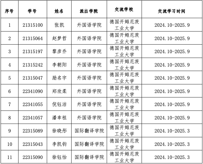 关于交流学习推荐名单公示的通告(德国开姆尼茨工业大学)
